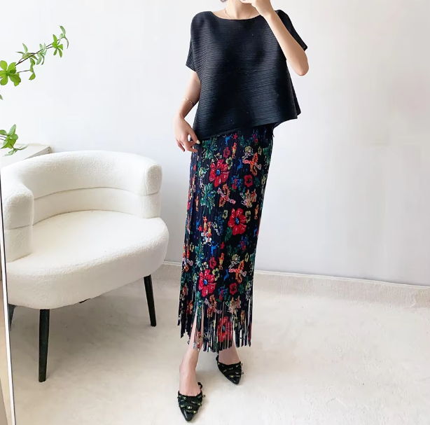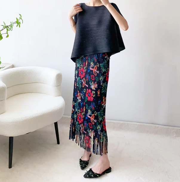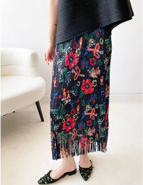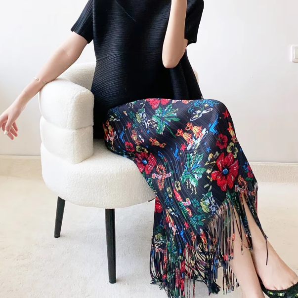 A-Line Pleated Retro Floral Long And Midi-Ancient Tassel Elegant Skirts