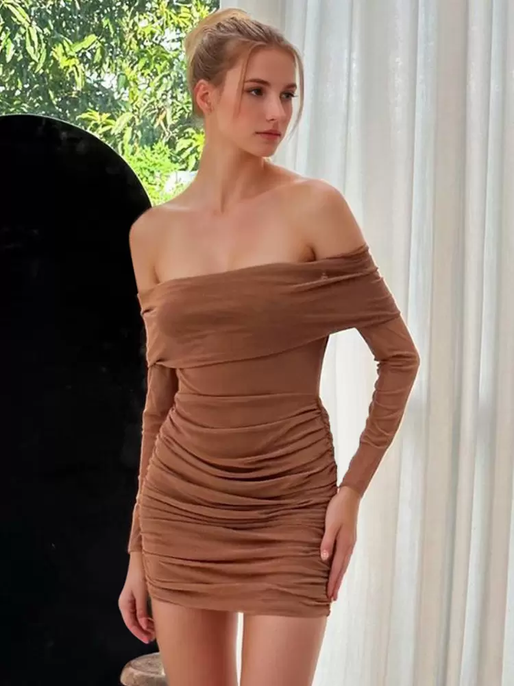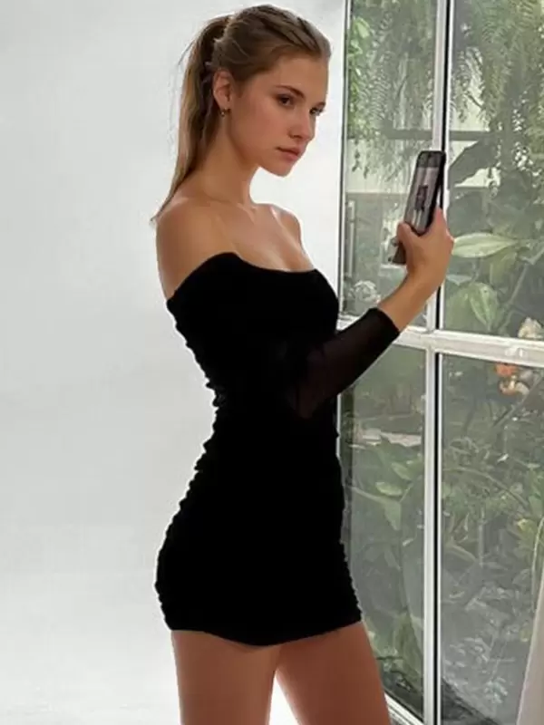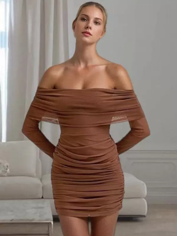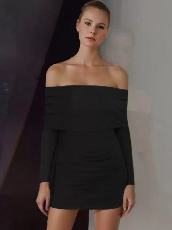 Bateau Neck Pleated Stretch Chic Long Sleeves Pencil Bodycon Dress