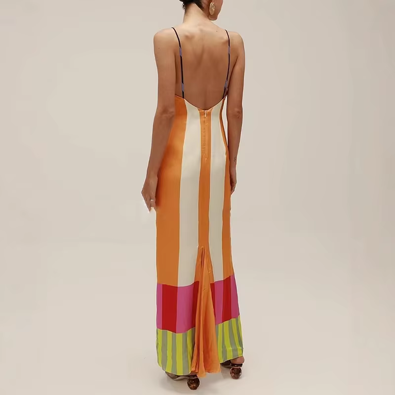 Bohemian Contrast Striped Print Strap V-Neck Backless Hollow Split Maxi Dress