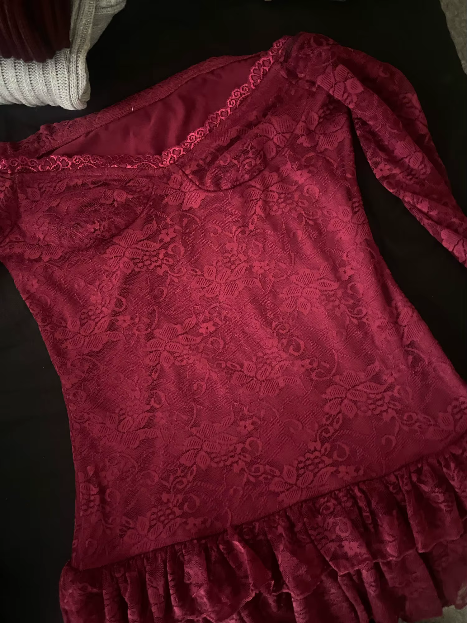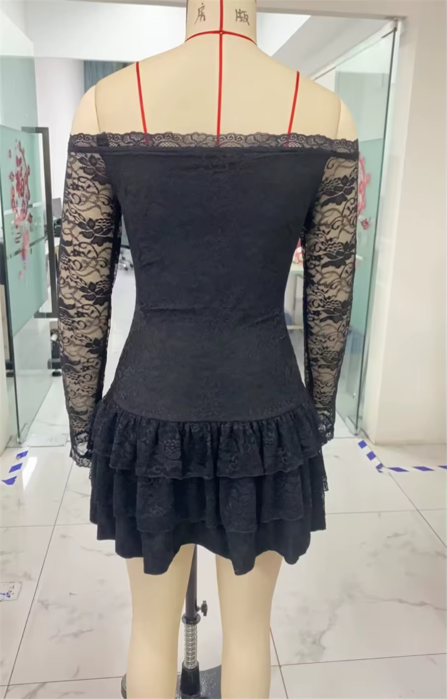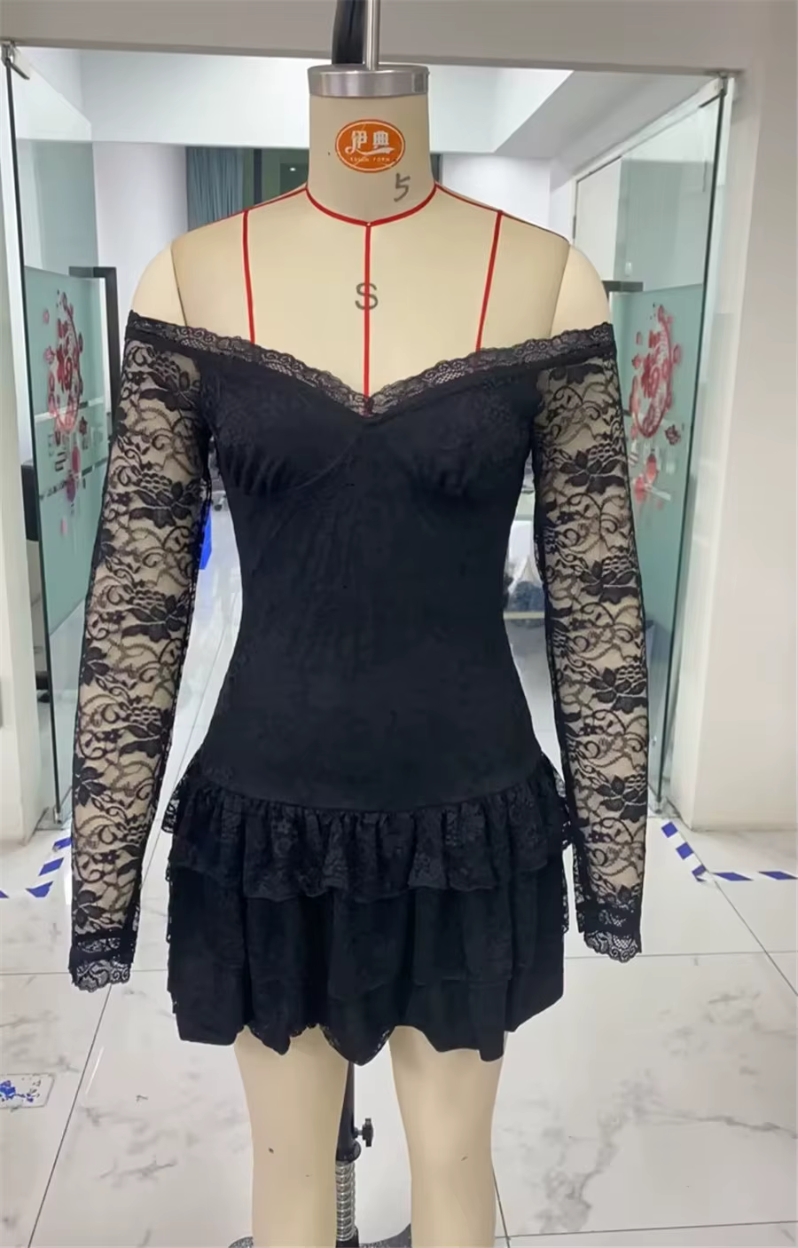 Casual Boat Slash Neck Off Shoulder Ruffles Long Sleeve Lace Mini Dress