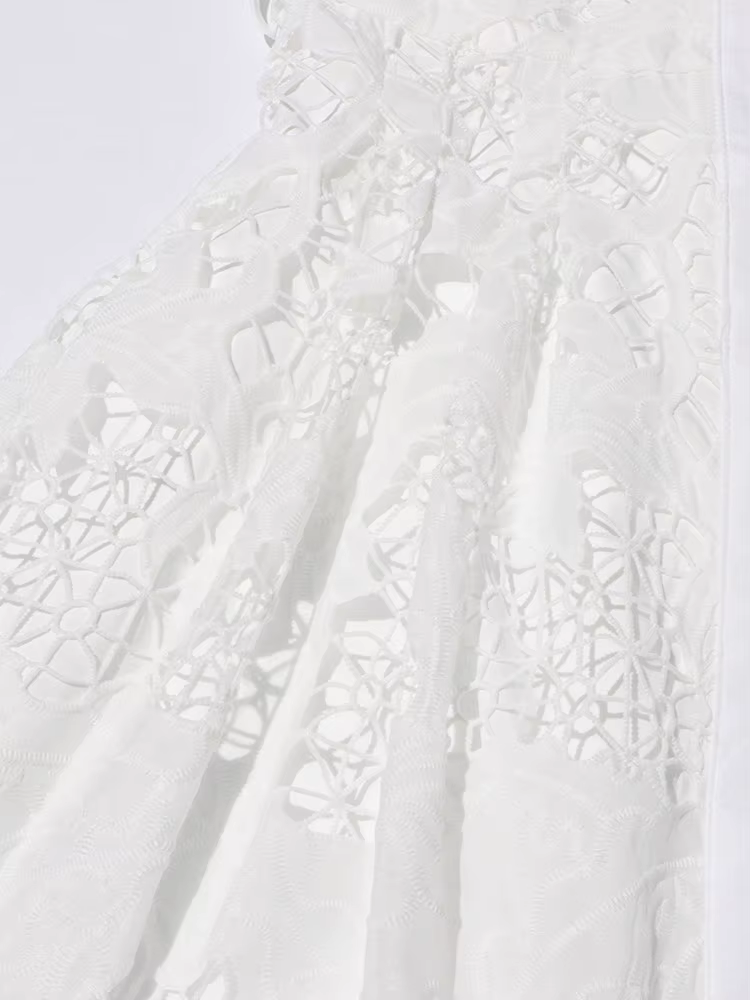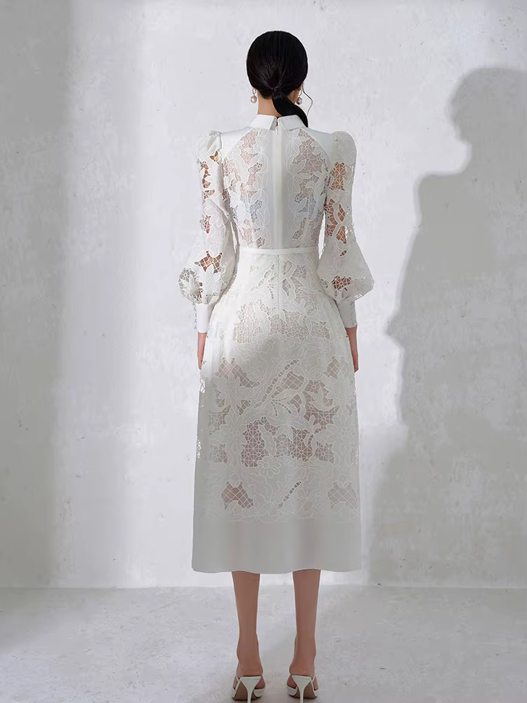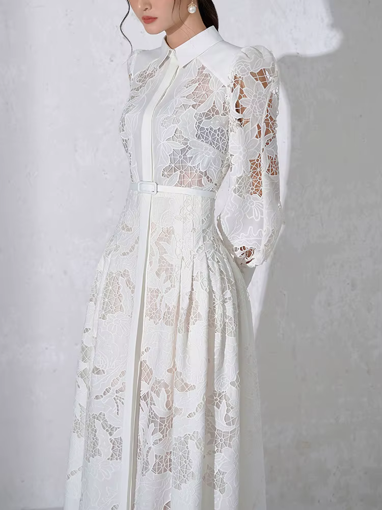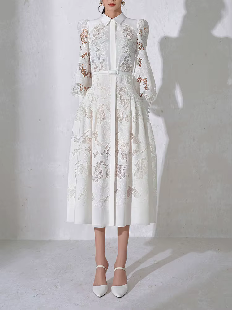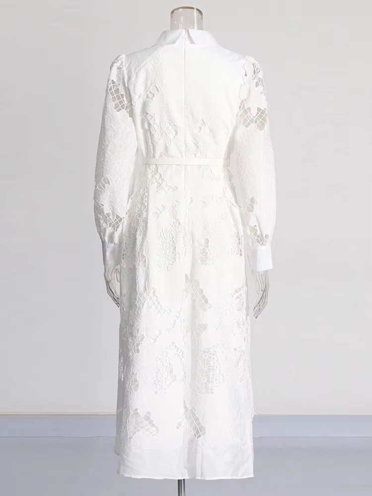 Casual Patchwork Lace Hollow Out Lapel Lantern Sleeve Belt Solid Formal Midi Dress