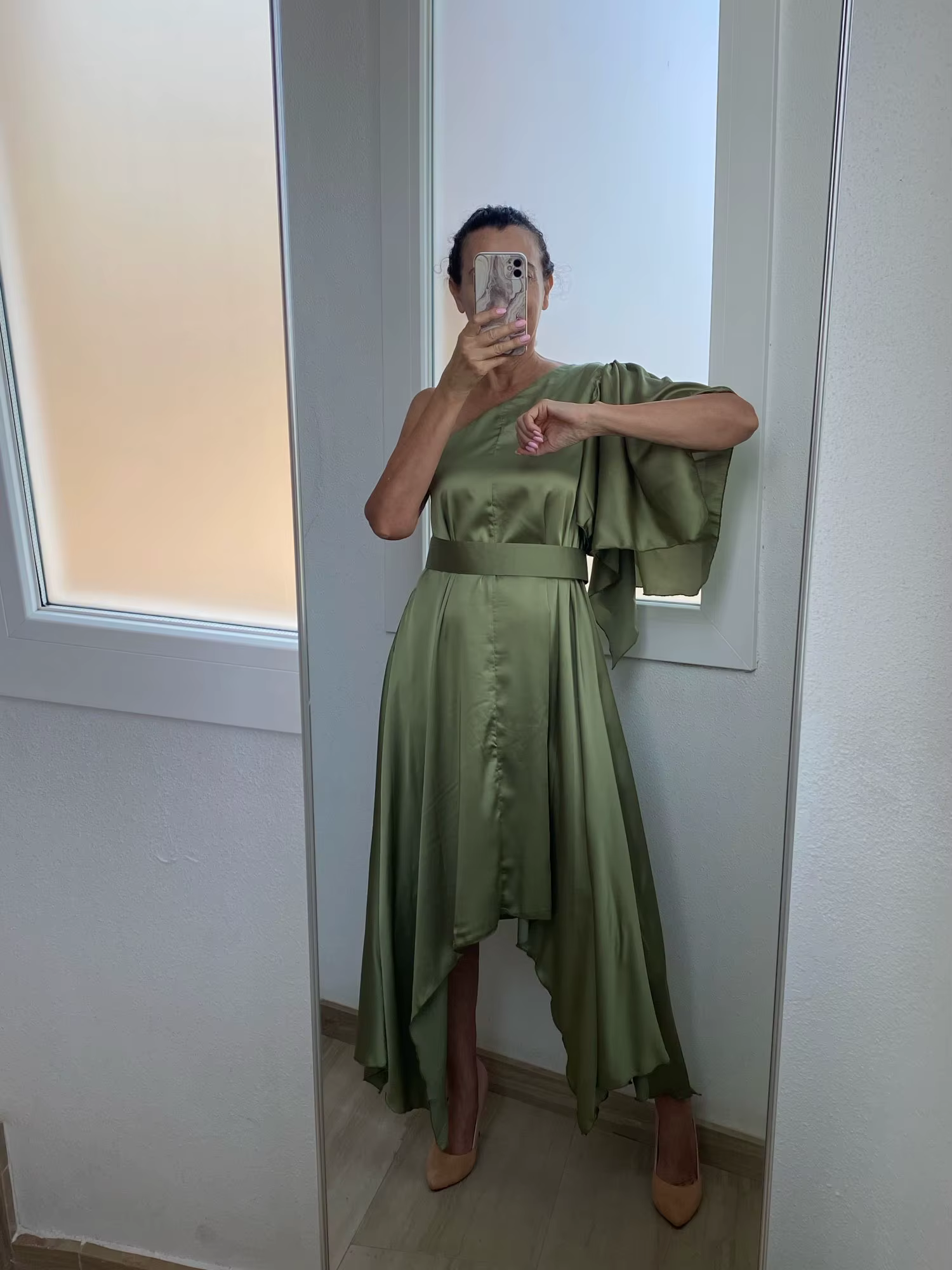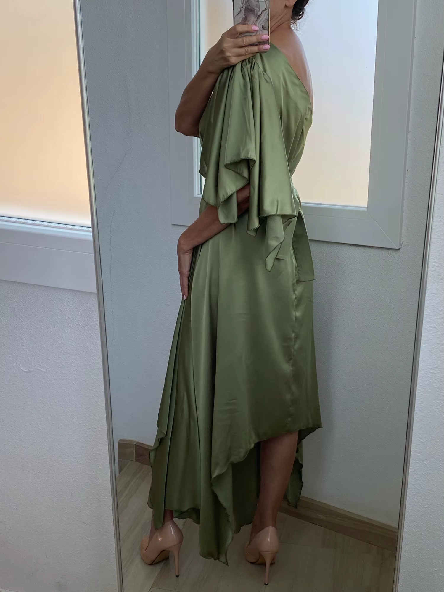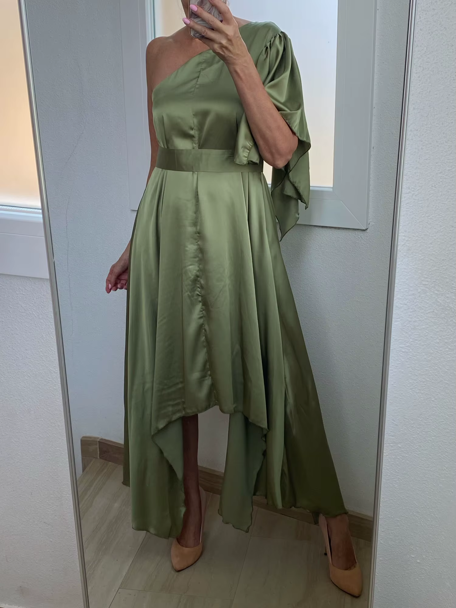 Casual Simple Solid One Shoulder Nipped Waist Irregular Lace Up Midi Dress