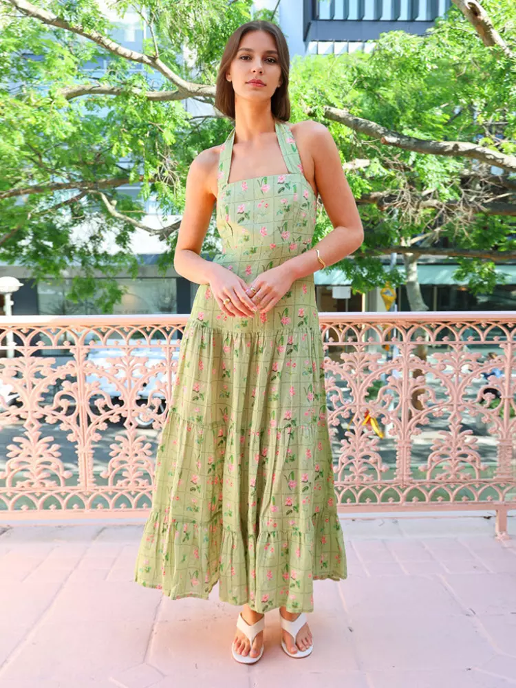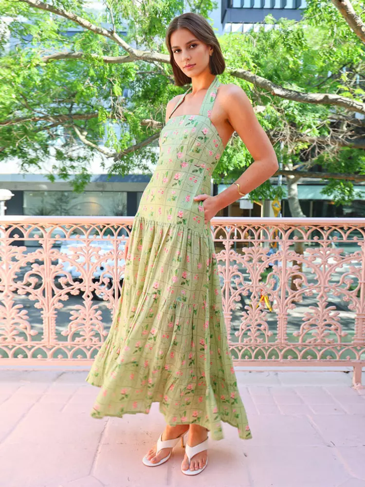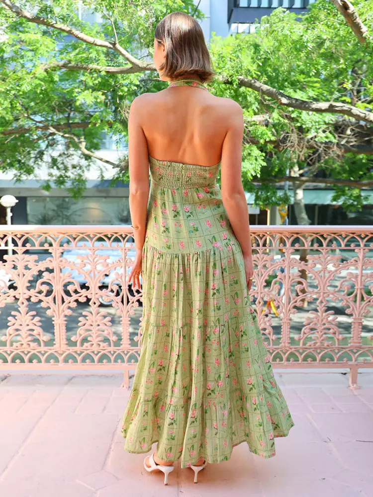 Casual Sleeveless Halter Neck Backless Layered Floral Print Maxi Dress