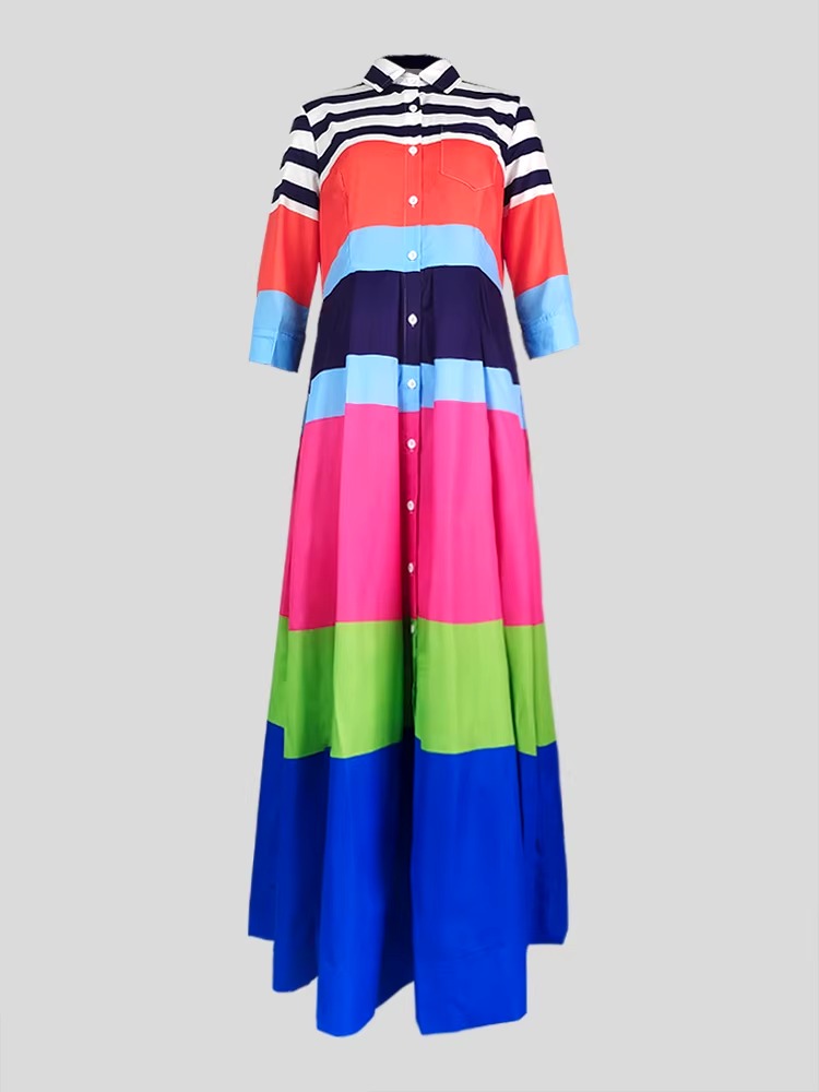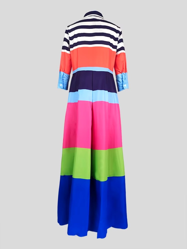 Casual Striped Turn-down Collar empire Waist Pleated A-LINE Vacation Shirt Dresses