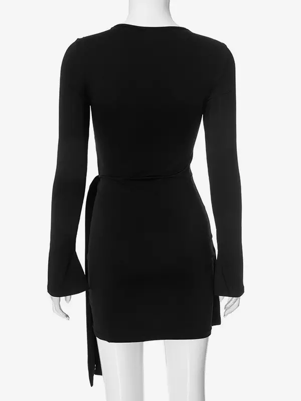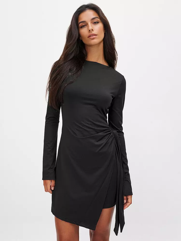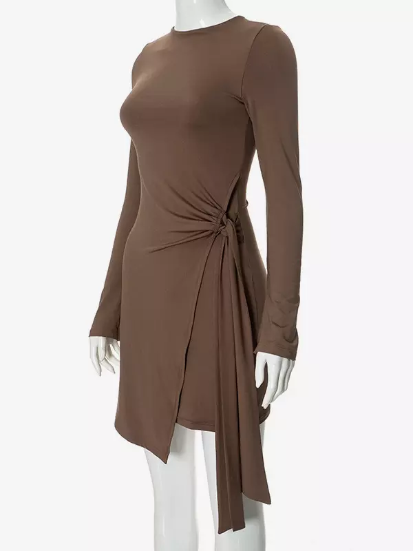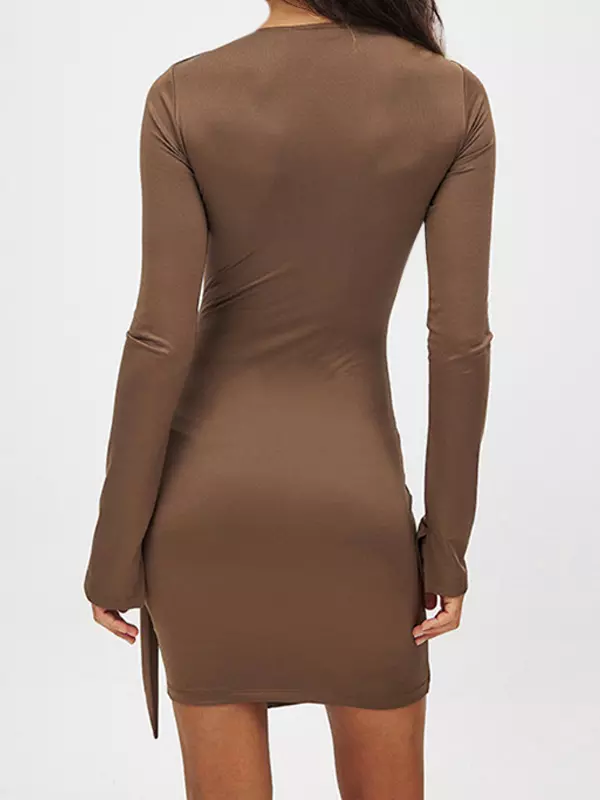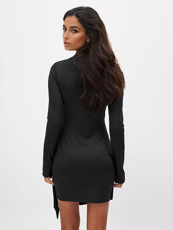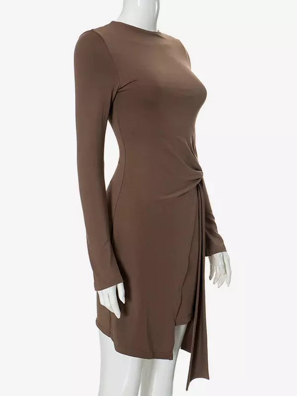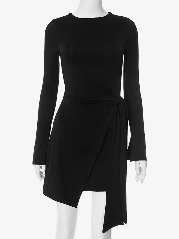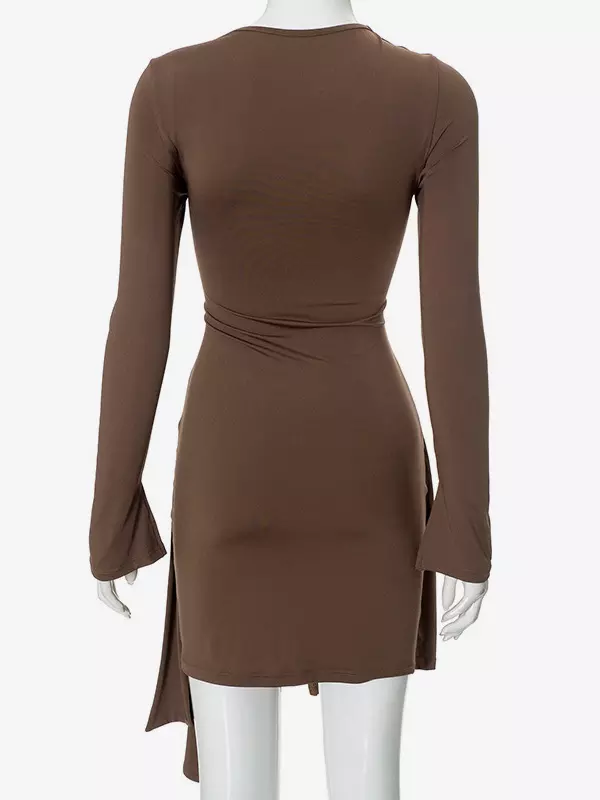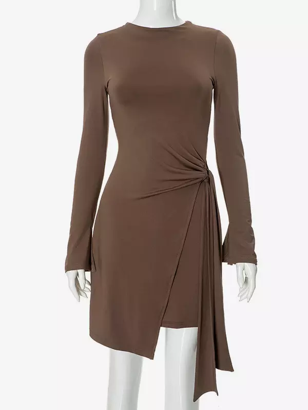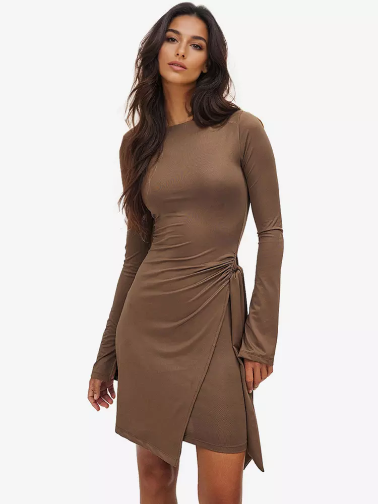 Elegant Asymmetrical Hem Long Sleeve Ruched Bodycon Mini Dress