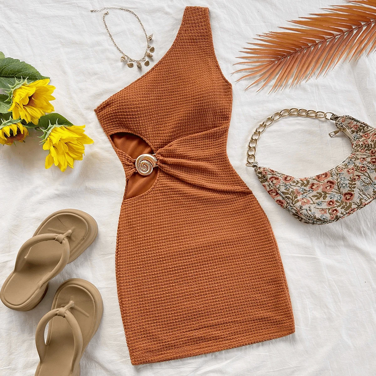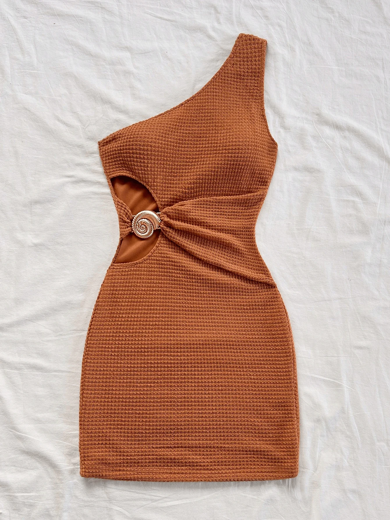 Elegant Diagonal Collar Off-the Shoulder Hollowed-Out Metal Buckle Mini Dress