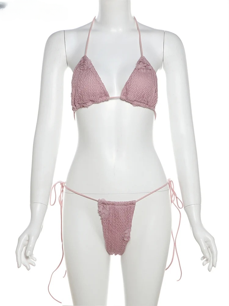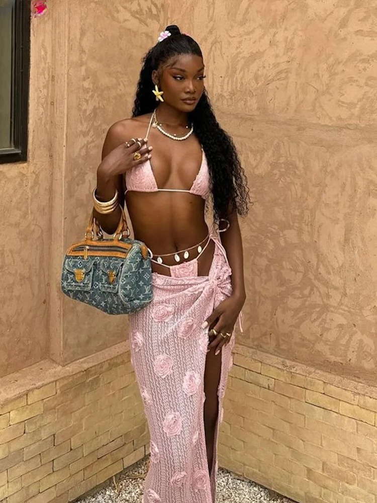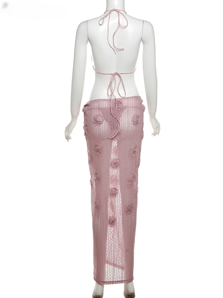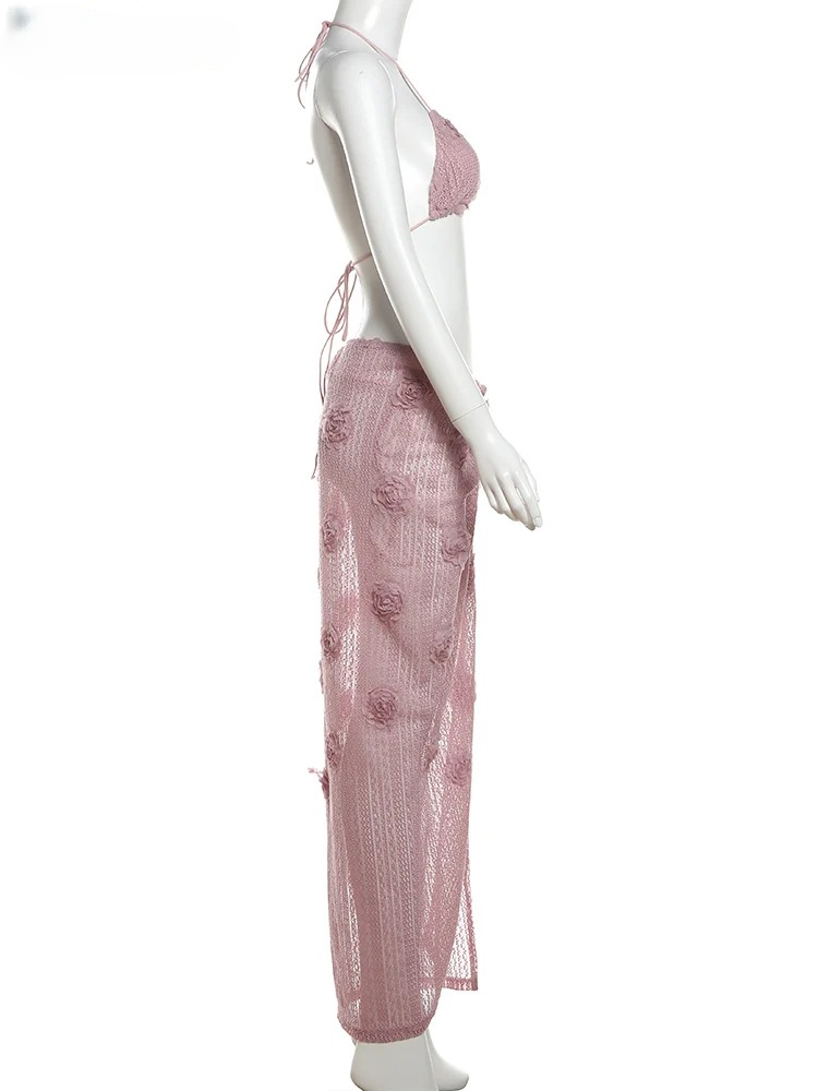 Elegant Flowers Knit Beach Style Halter Wrapped Skirts Ankle-Length 3-Piece Suits
