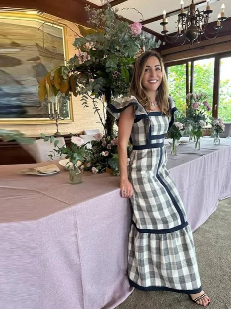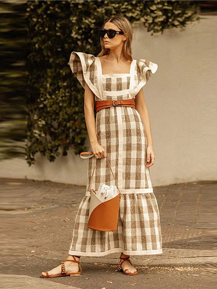Elegant Flying Sleeve Striped Ruffled Pleated Square Collar Patchwork Maxi Dress