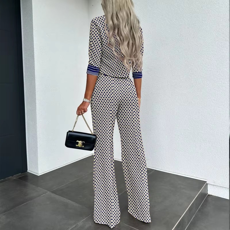 Elegant Half Long Sleeves Scarf Collar Top Bottoms Straight Pants Sets