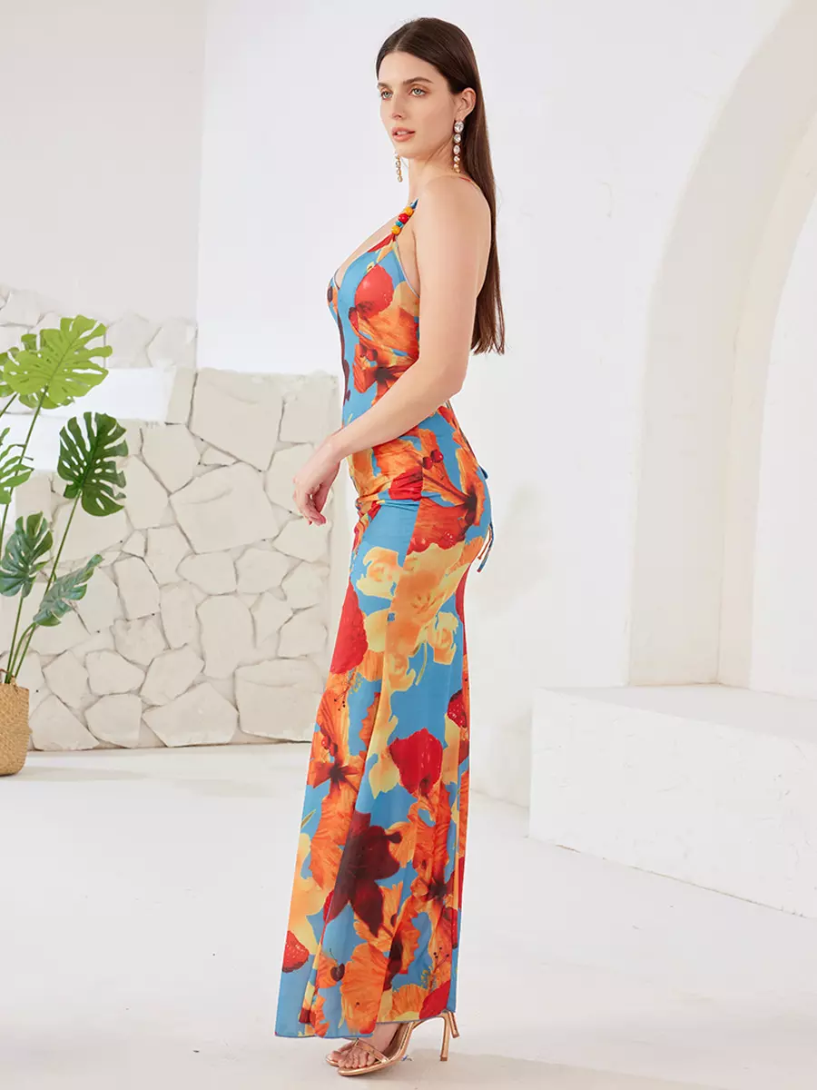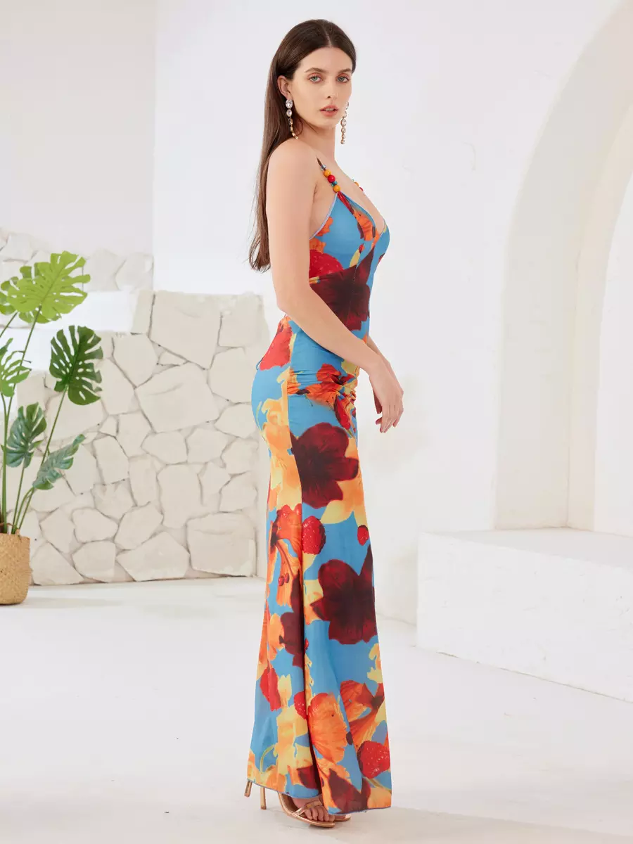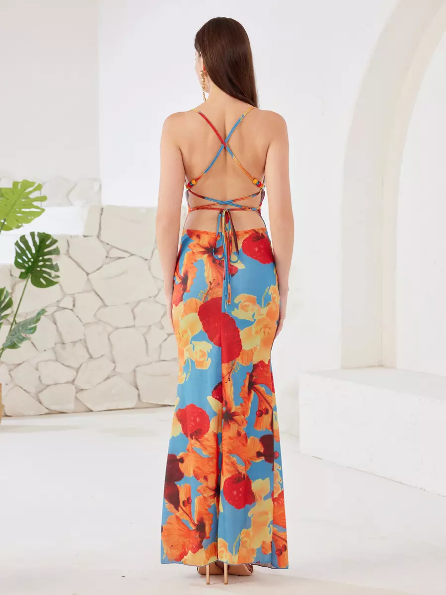 Elegant Open Back Spaghetti Straps Bodycon Floral Maxi Dress