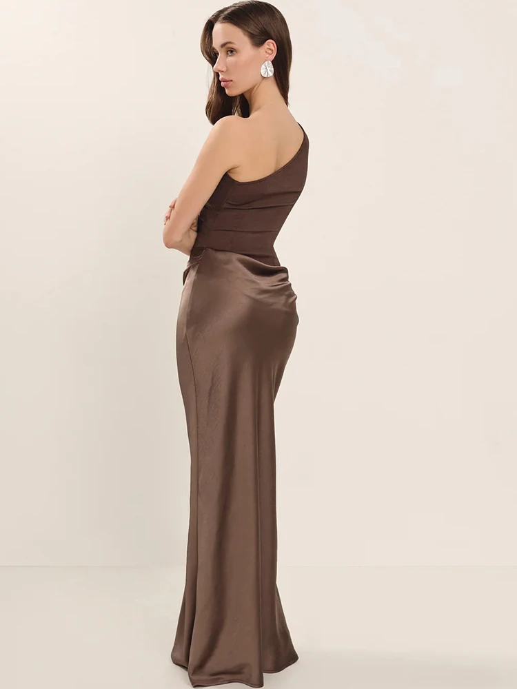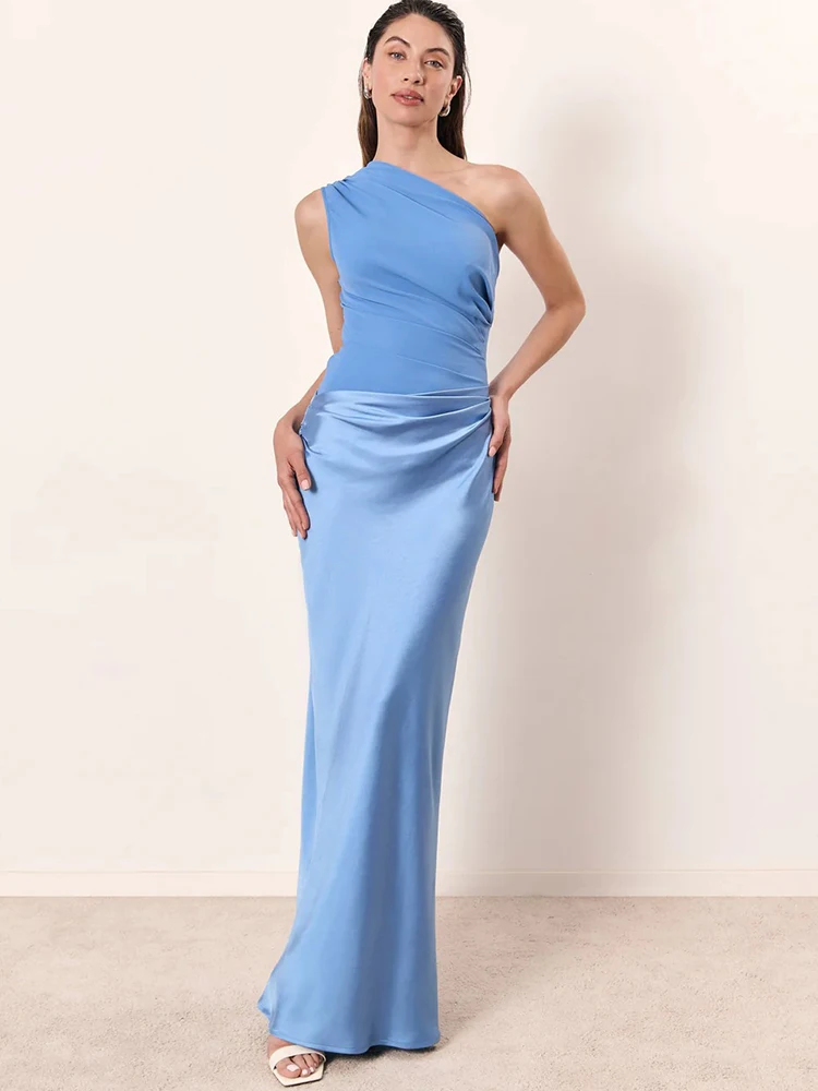 Elegant Patchwork Satin One Shoulder Sleeveless Maxi Dress