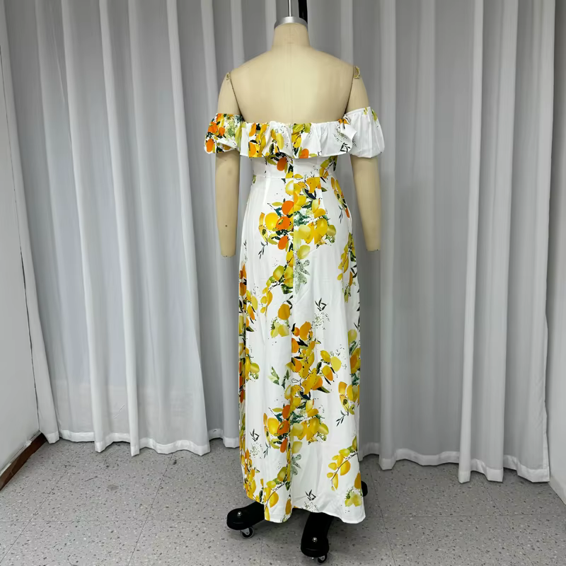 Elegant Printed Off Shoulder Lantern Sleeve Ruffles Slim Nipped Waist Maxi Dress