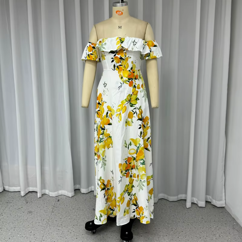 Elegant Printed Off Shoulder Lantern Sleeve Ruffles Slim Nipped Waist Maxi Dress