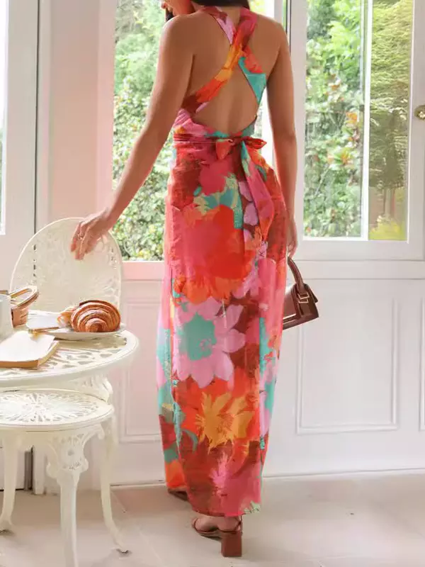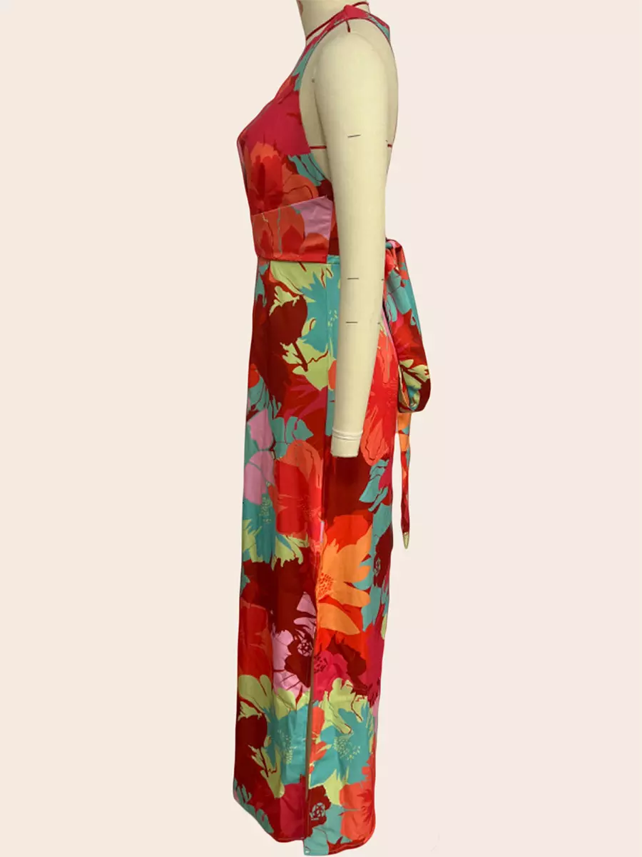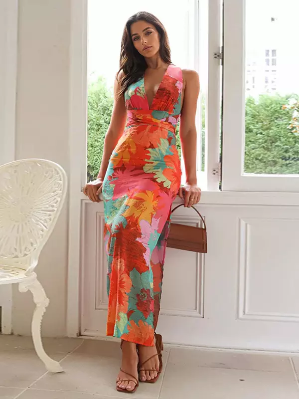 Elegant Ruffles Floral Print V-Neck Sleeveless Long Maxi Dress