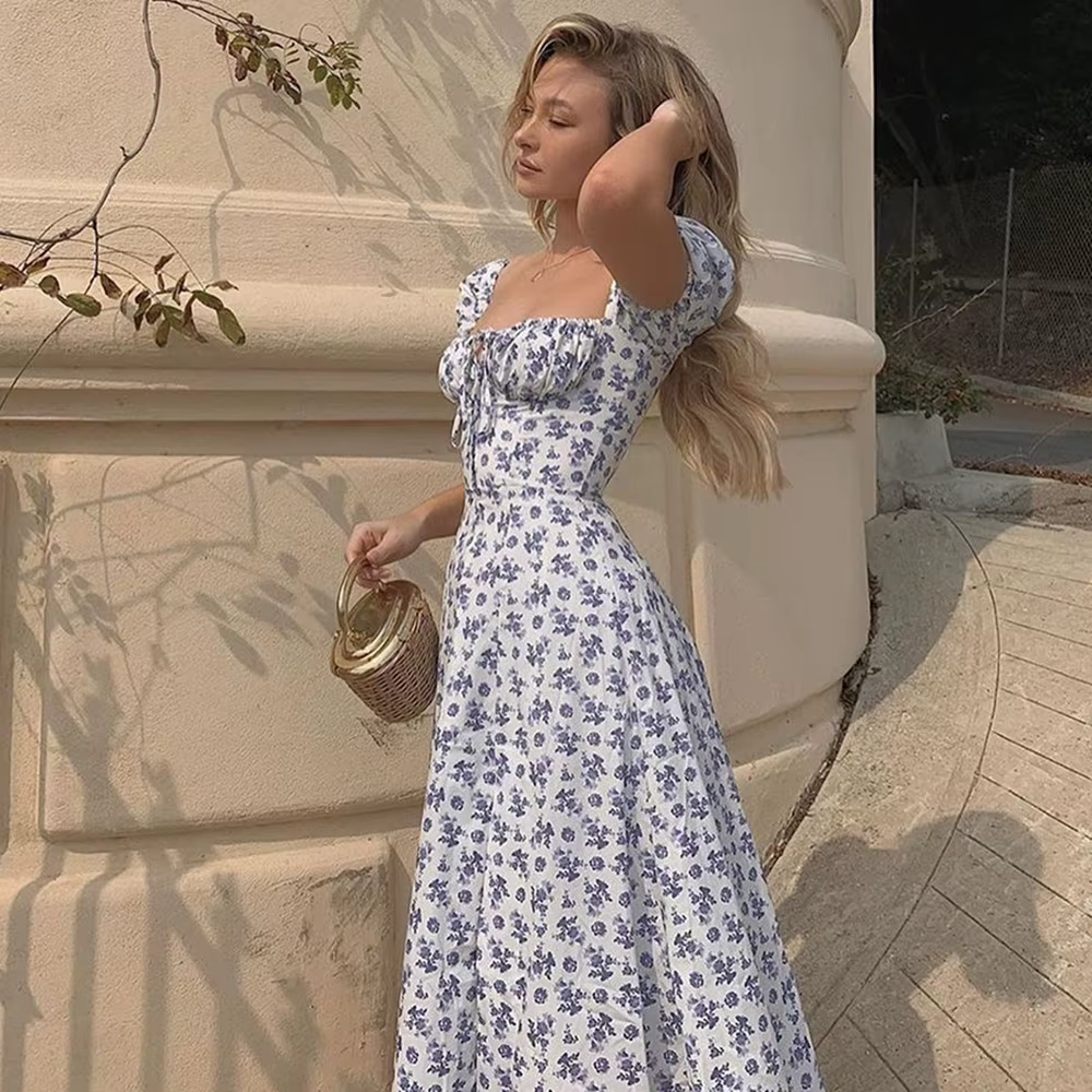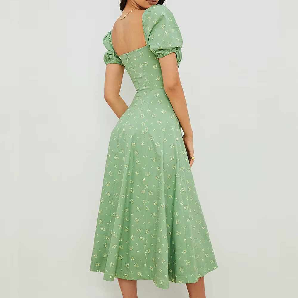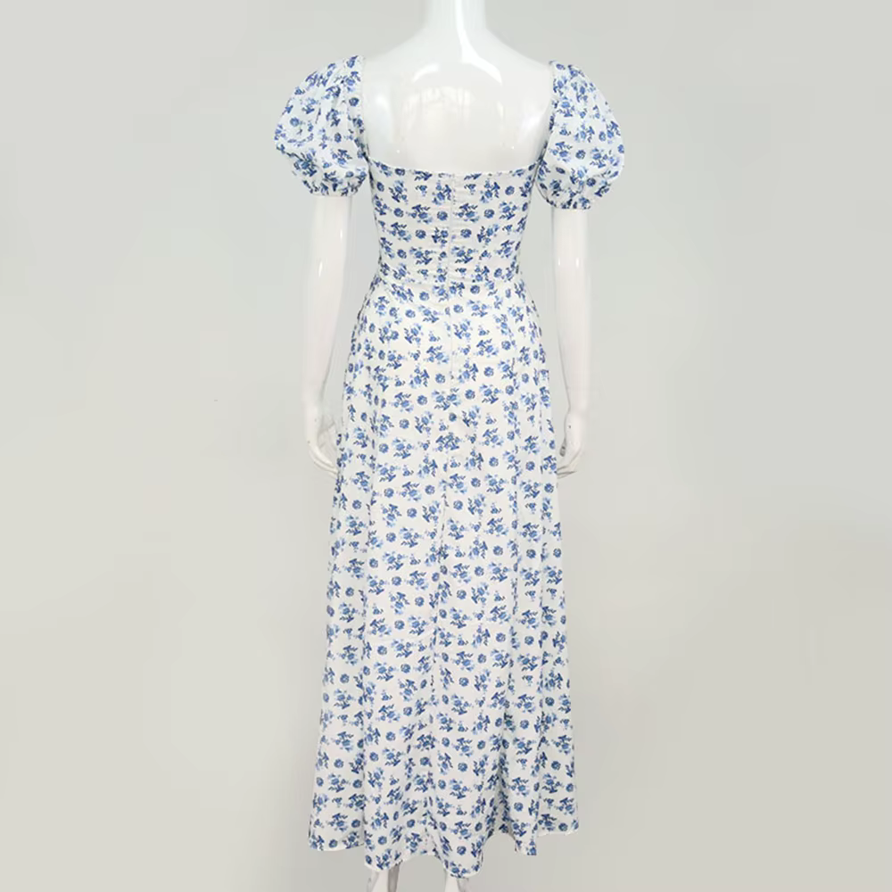 Elegant Square Collar Puff Sleeve Floral Printed Long Maxi Dresses