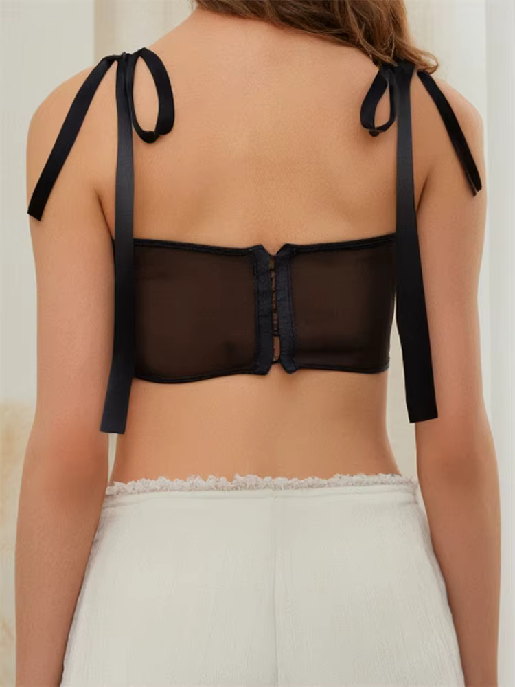 Elegant V Neck Tie-up Strap Vest Back Hook and Eye Sheer Camisoles 3D Flower Patchwork Tank Tops