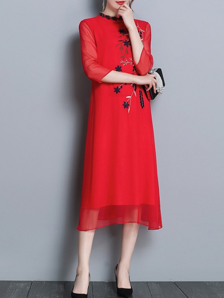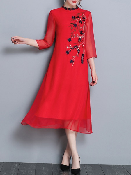 Folk Style Floral Embroidery Silk Dress
