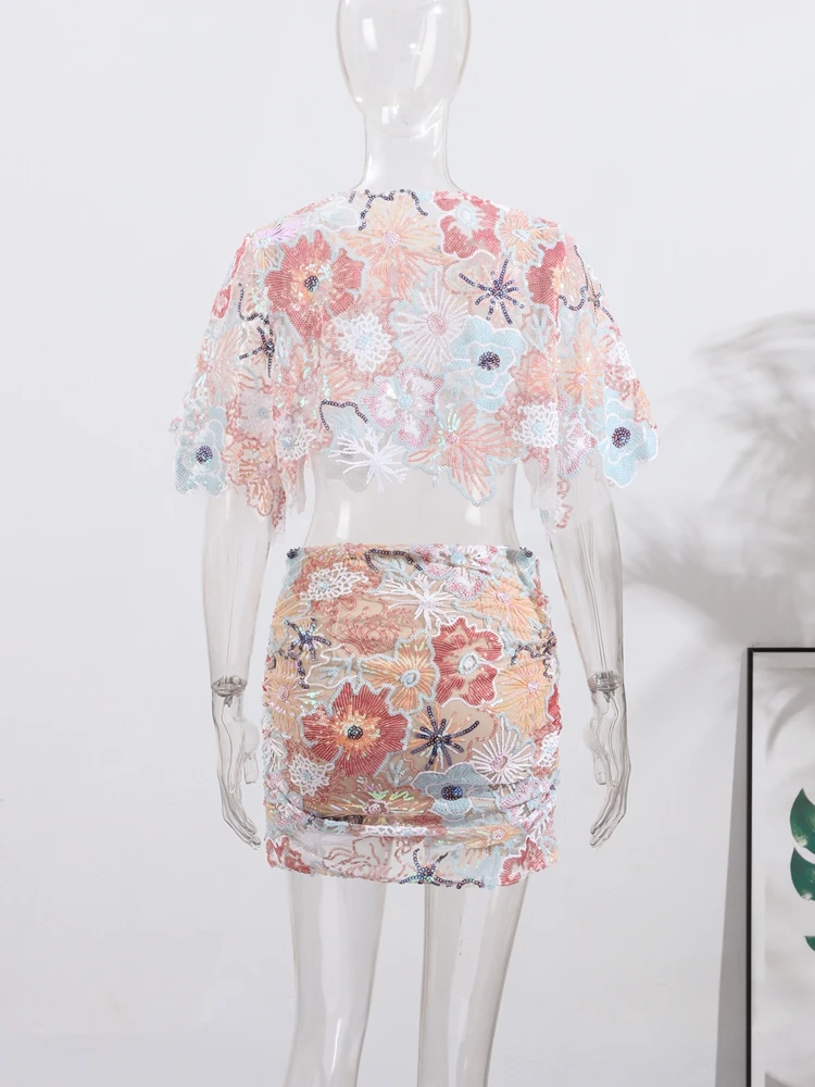 Luxury Transparent Embroidery Sequined O-neck Short Sleeve Top Skirt Suits