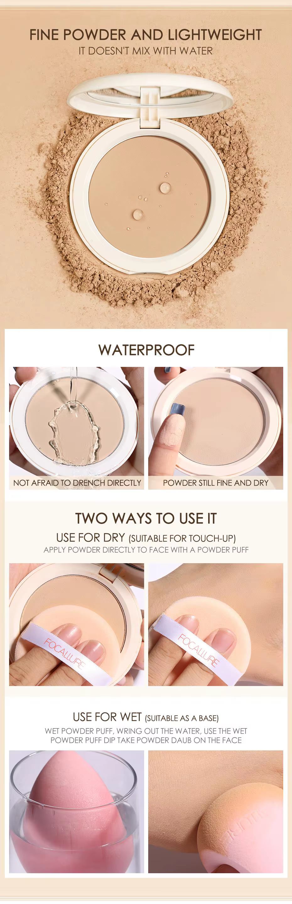 Use for wet: Wet powder puff, wring out the water, use the wet powder puff dip take powder daub on the face