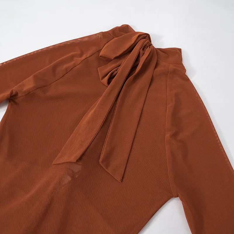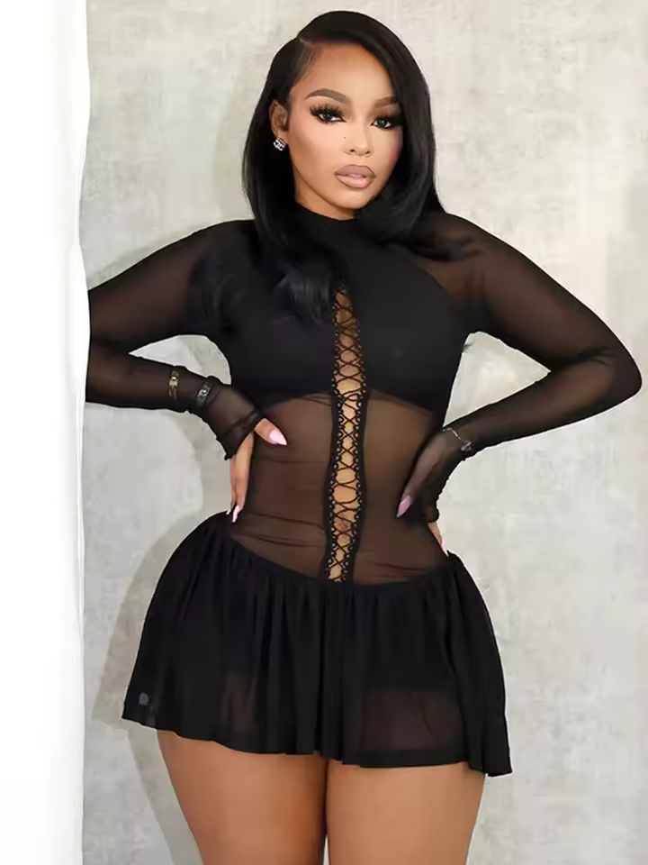 Mesh Patchwork Pleated Full Sleeve Solid Trend Stretch Midnight Party Club Bodycon Dress