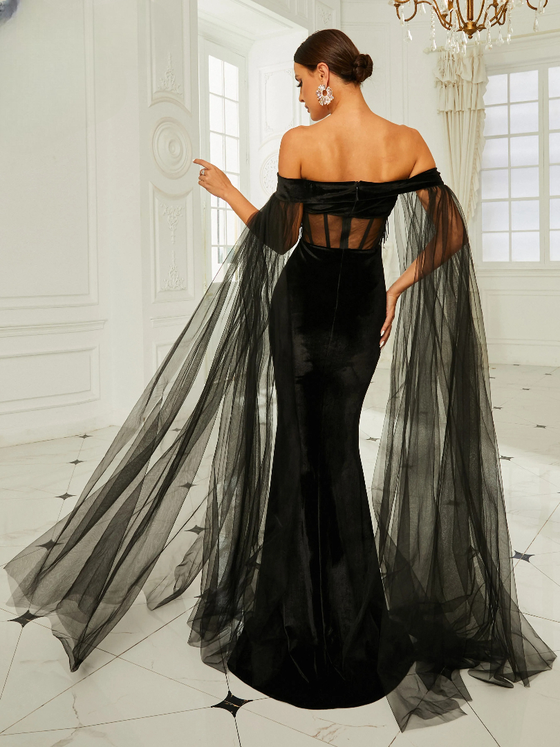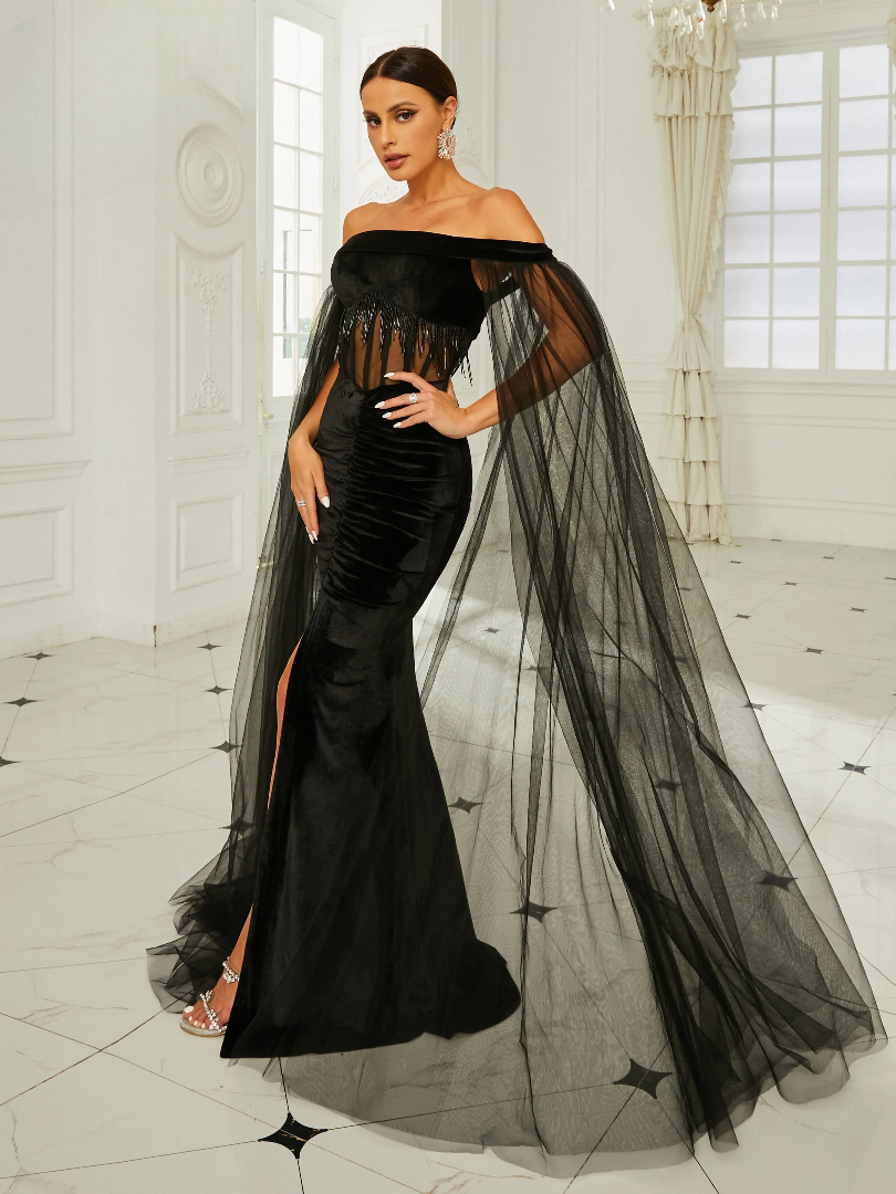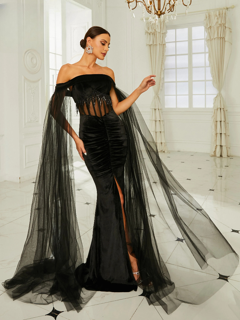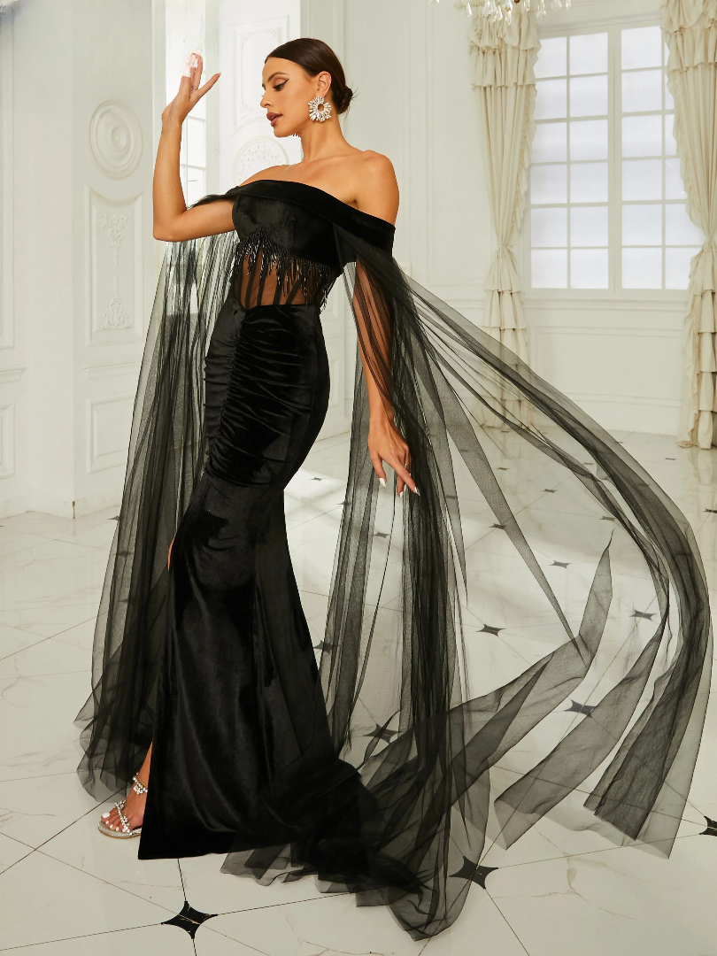Off Shoulder Mesh Long Sleeve Tassels Bodycon Mermaid Party Dresses Prom Gown