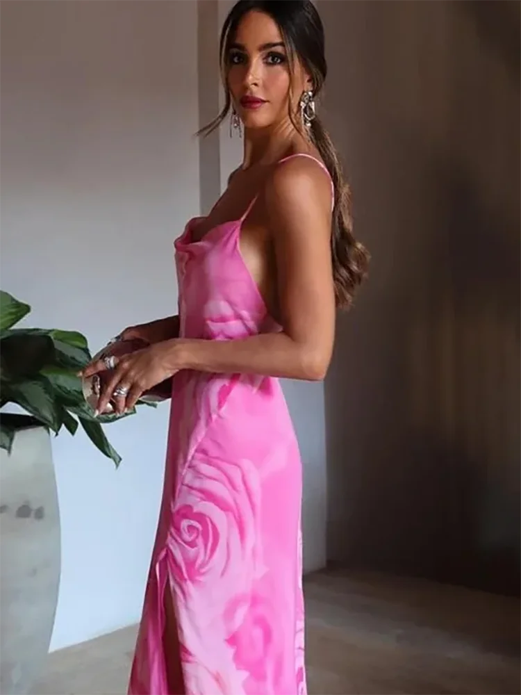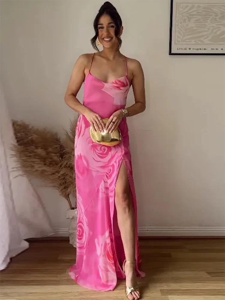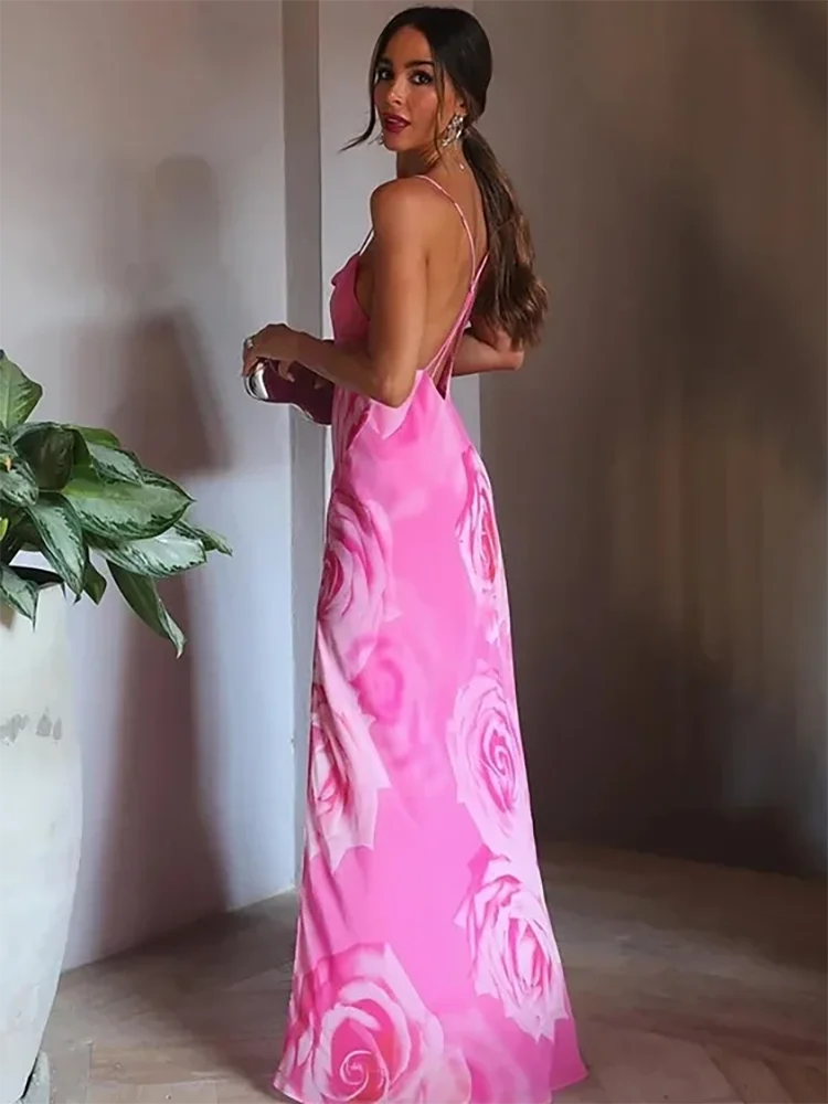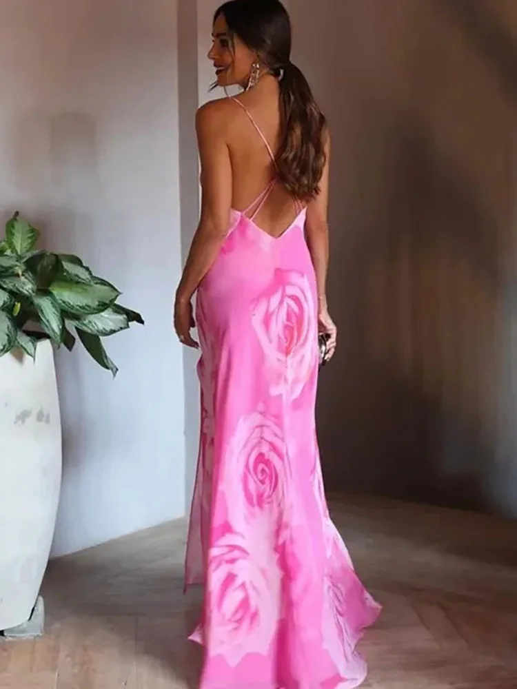 Printed Camisole Ruffled Floral Open Back Mid V-neck Zipper Beach Holiday Long Chic Dress