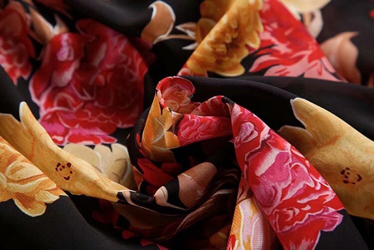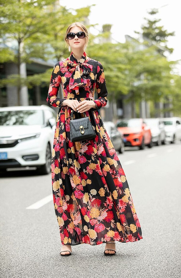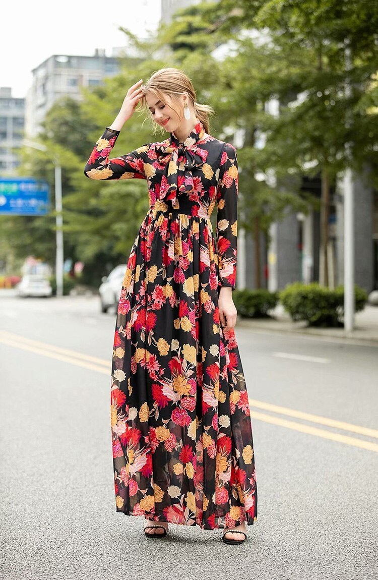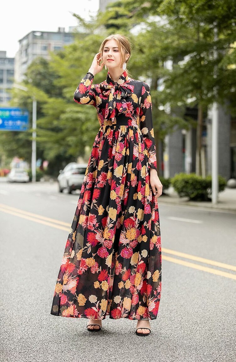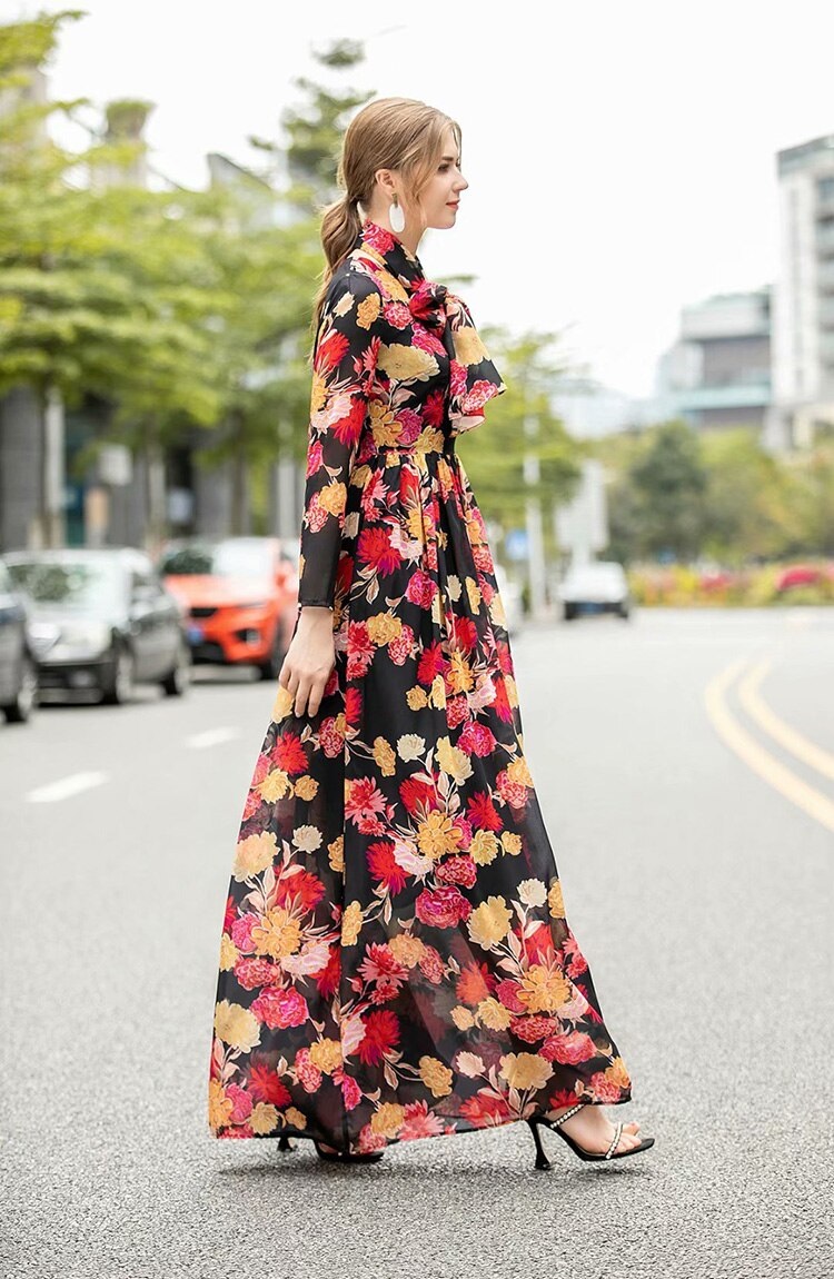 Runway Long Sleeve Elegant Flower Print Bohemian Robe Maxi Dress