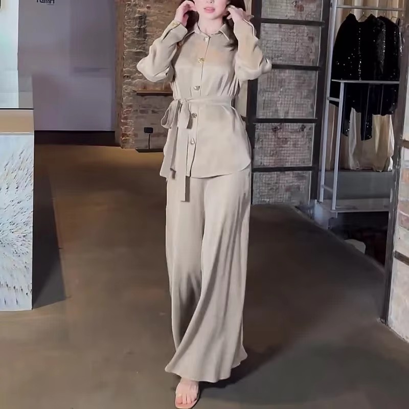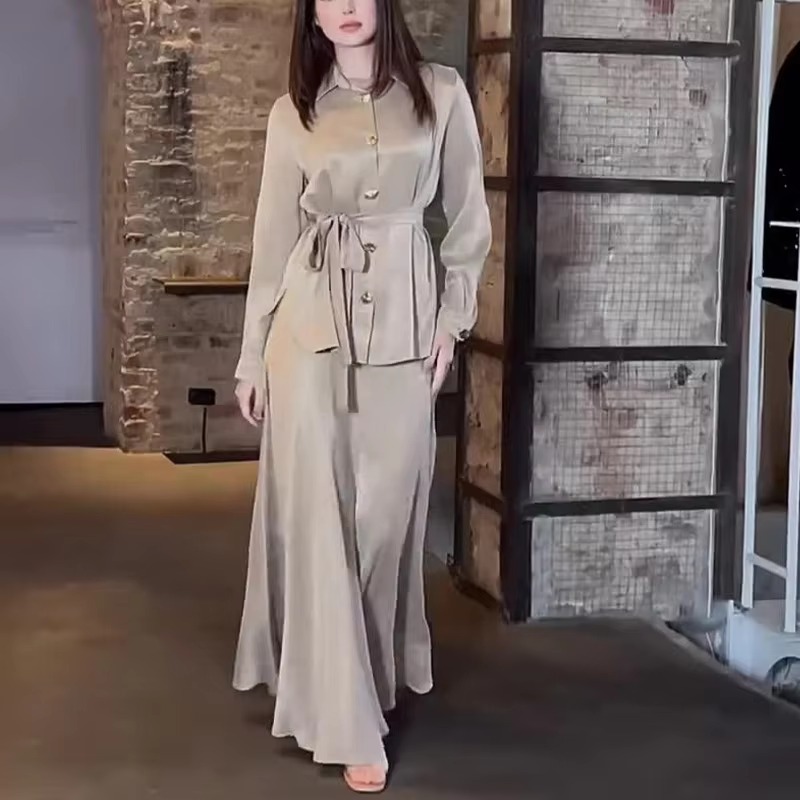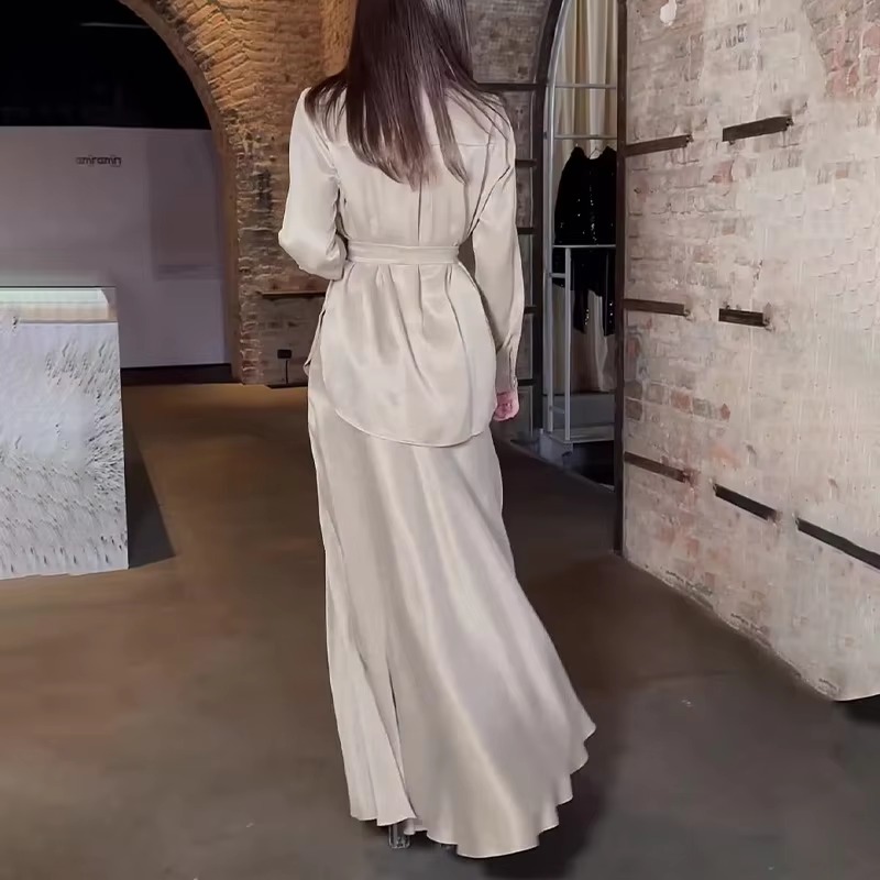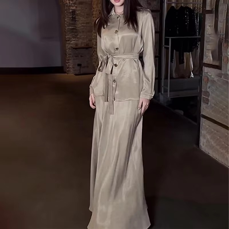 Trendy Solid Color Shirt Lace-up Waist Long Sleeve Casual Loose Dresses