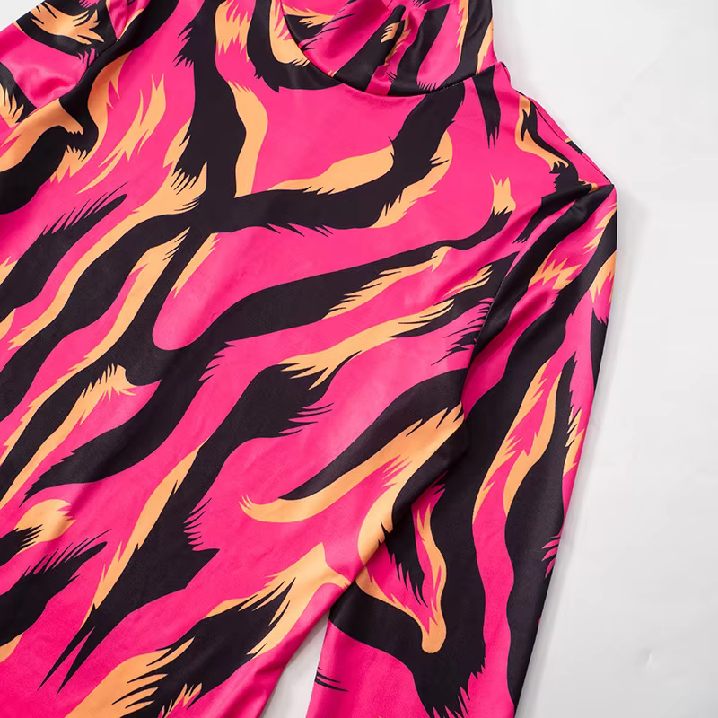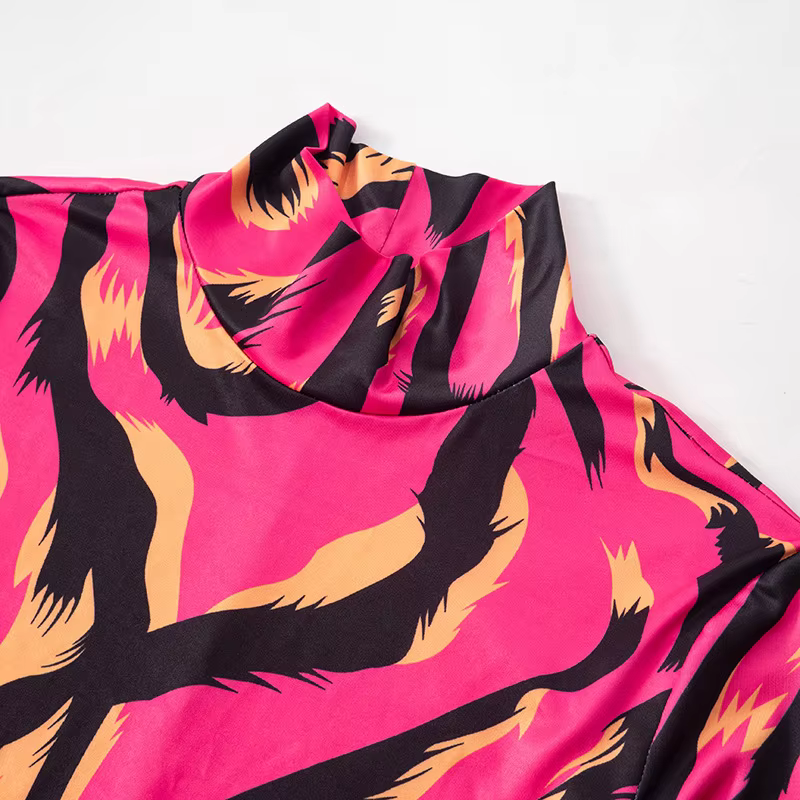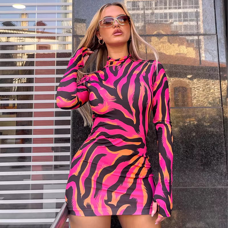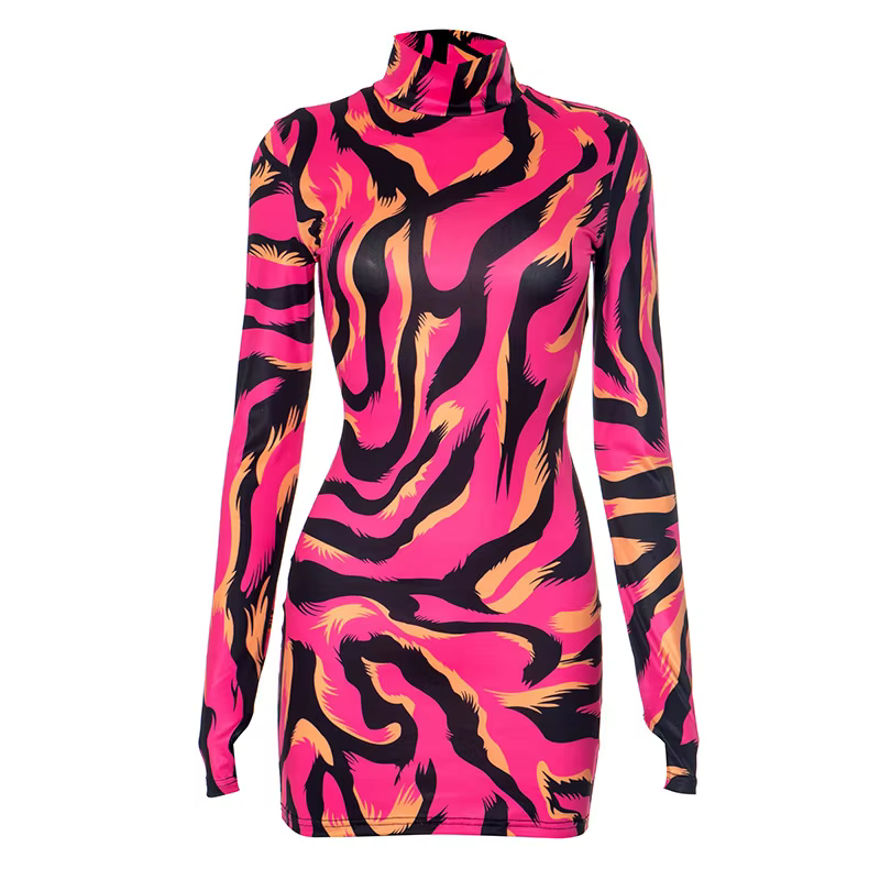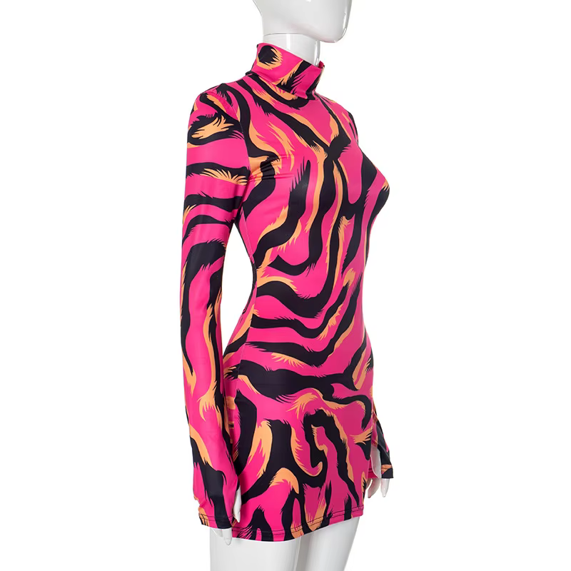 Trendy Striped Sheath Stretchy Long Sleeve Mock Neck Bodycon Printed Mini Dress